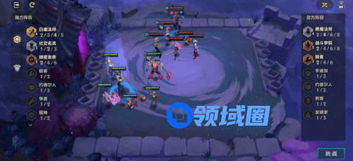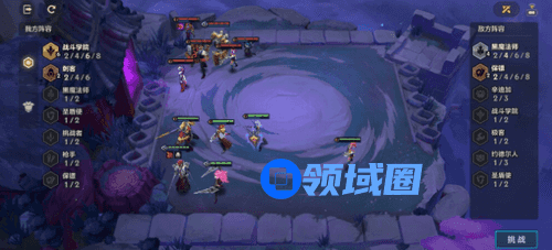 1、对面羁绊为4黑魔法师、2保镖,我方羁绊为6战斗学院和和2刺客(可以合成一个刺客转职)