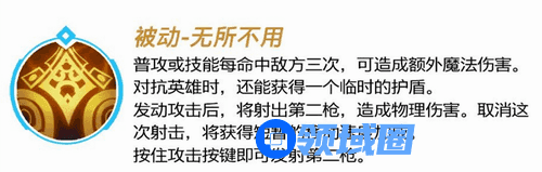 普攻或技能每命中敌方三次,可造成额外魔法伤害。对抗英雄时,还能获得一个临时的护盾。