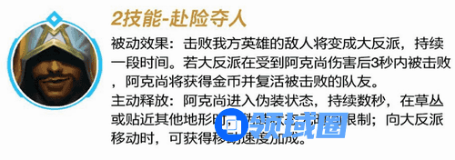 主动释放:阿克尚进入伪装状态,持续数秒,在草丛或贴近其他地形时,伪装状态无时间限制;向大反派移动时,可获得移动速度加成。