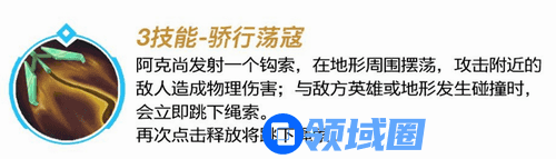 阿克尚发射一个钩索,在地形周围摆荡,攻击附近的敌人造成物理伤害;与敌方英雄或地形发生碰撞时,会立即跳下绳索。