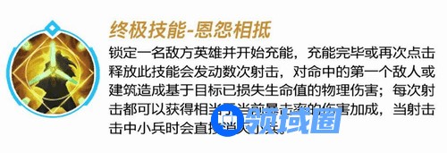锁定一名敌方英雄并开始充能,充能完毕或再次点击释放此技能会发动数次射击,对命中的第一个敌人或建筑造成基于目标已损失生命值的物理伤害;每次射击都可以获得相当于当前暴击率的伤害加成,当射击击中小兵时会直接消灭小兵。