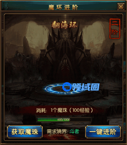 二.魔环进阶:魔环的进阶需要俩方面的要求,首先就是境界,玩家自身境界达到要求后才可以进阶魔环。境界达成后可以通过魔珠可以提升魔环的等价,每个魔珠可以给魔环带来100点进阶经验值。魔环的每次成长可以给玩家带来大量的战力。