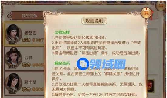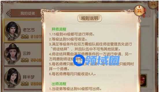 1、玩家在15级到49级之间可以进行拜师,达到50级可以收徒