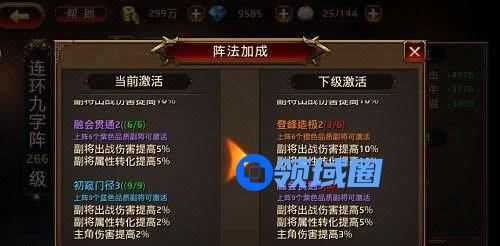 在《刀锋无双》中,想要一次性提升攻击、生命、护甲、暴击等7种属性,首选提升阵法等级。开启阵法系统,主公们可以看到目前自己开启的阵位数量。选择品质及 星级越高的武将上阵,主公们获得的战力加成将越高。当主公们上阵的武将达到3、6、9个紫色以上品质时,即可激活境界属性。武将的品质越高,数量越多,阵 法的境界属性越强。如上阵6个紫色品质副将可激活融会贯通2境界,副将出战伤害和副将属性转化将提高5%,而上阵6个橙色品质副将可到达登峰造极2境界, 副将出战伤害和副将属性转化提高10%。所以各位主公在升级阵法的同时,也不能忘记培养武将哦!
