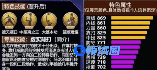 马龙拥有紫色的盖帽防守抢断,金色篮板属性,10级篮板震慑、7级进攻篮板精英、7级护球者、4级禁飞区、4级盗球专家,有全面高效的内线防守能力。同时拥有紫色的速度与追身盖帽动作,关键时刻可及时追帽对手。