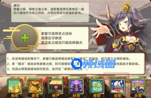 5、每天11点、17点、20点,会有NPC提前预告攻打你们家族占领的部分城池,这时候把自己的部队派去守城,击退这些NPC会得判金,这是最重要的奖励,你以后判金的主要来源就是这里了。