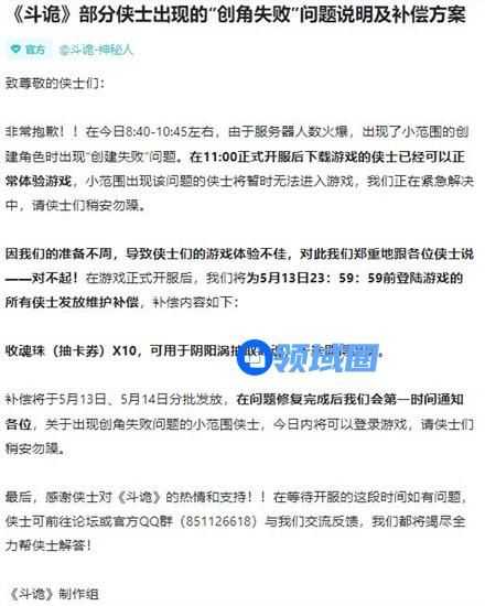 补偿将于5月13日、5月14日分批发放,在问题修复完成后我们会第一时间通知各位,关于出现创角失败问题的小范围侠士,今日内将可以登录游戏,请侠士们稍安勿躁。