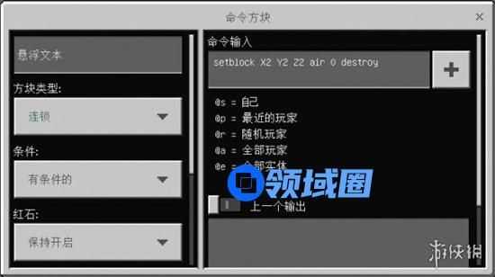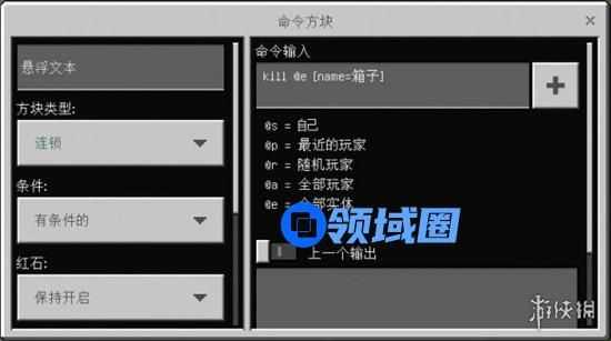 方块类型设置为连锁条件为有条件的红石设为保持开启