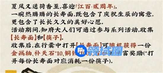 活动奖励:在2022年7月1日游戏更新之后收集【长寿面】跟【筷子】即可兑换获取建筑、画轴、金画轴、补天石、稀有花圃等奖励。