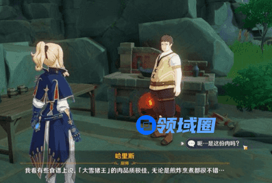 获取足够食材后返回去寻找哈里斯进行对话,这时哈里斯又提出还需要一份「大雪猪王的肉」。按照攻略进行的小伙伴们这时只需要掏出刚才击杀大雪猪王获得的「大雪猪王的肉」就好啦,没有的小伙伴可以按阶段一所示位置,去击杀一只大雪猪王再回来即可。
