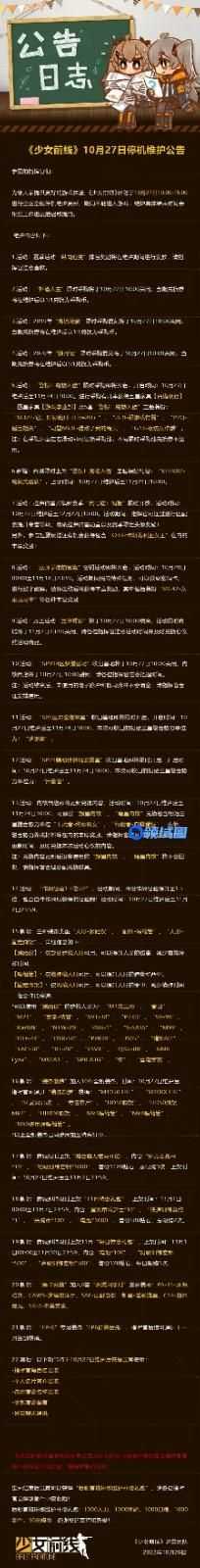 亲爱的指挥官: 为了给大家带来更好的游戏体验,《少女前线》计划于10月27日10:00~15:00进行全区全服停机维护更新,期间不能进入游戏。详情请看下图!