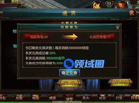 角色等级达到80级之后即可开启兑换修为值,每次可以使用一千万经验和一百万金币兑换为一千点修为值,每次兑换的成功几率为百分之50。