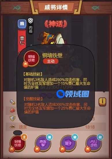 曹仁:血量550亿,大招铜墙铁壁,释放技能的效果是对随机3名敌人造成250%攻击伤害,同时为全体友军增加一个15%曹仁最天生命值的护盾。