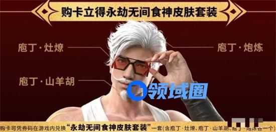 1、11月7日至12月4日期间,玩家通过肯德基宅急送购买购买肯德基大神卡(90天)可以获得永劫无间限定版卡面,同时在卡包中可以查看“永劫无间食神皮肤套装”兑换码;