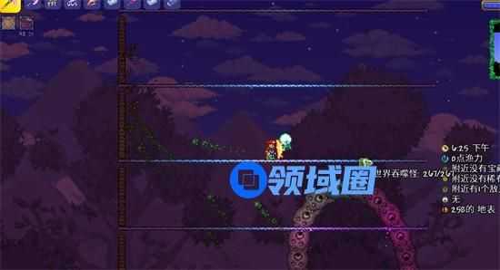 《泰拉瑞亚》打世界吞噬者的平台的极限高度是50格左右。再高环境就会脱离腐化之地,世界吞噬者就会自动离开。下面进行演示: