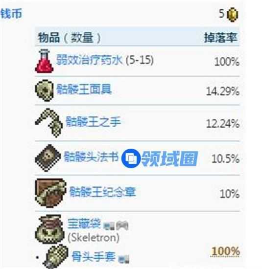 当我们击败骷髅王后掉落物品有,100%掉落物品有5金币、弱效治疗药水 (5-15)、宝藏袋、骨头手套。