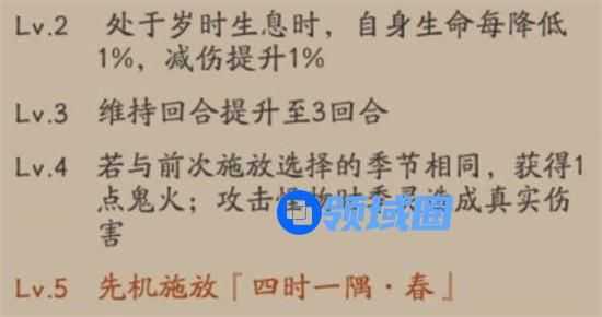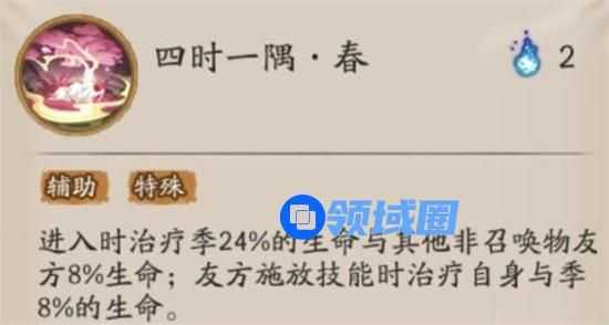 【施放】牺牲最大生命的24%(不足时保留1点),展开维持2回合的「四时一隅」并获得1层四季流转,同时根据所处季节施加额外效果。在「四时一隅」中自身无法被「四时一隅·春」之外的效果治疗或恢复生命,友方施放技能后将为敌方目标附加季灵。若与前次施放选择季节不同,自身获得岁时生息,持续2回合。