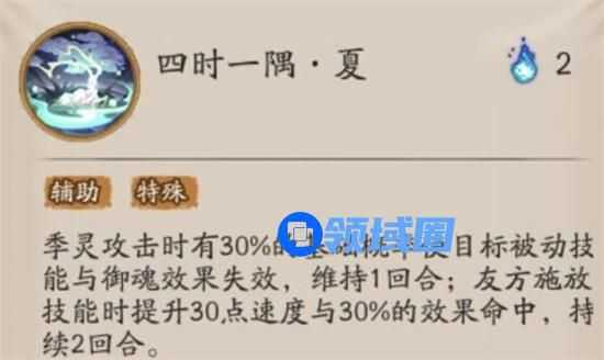 季灵攻击时有30%的基础概率使目标被动技能与御魂效果失效,维持1回合;友方施放技能时提升30点速度与30%的效果命中,持续2回合。
