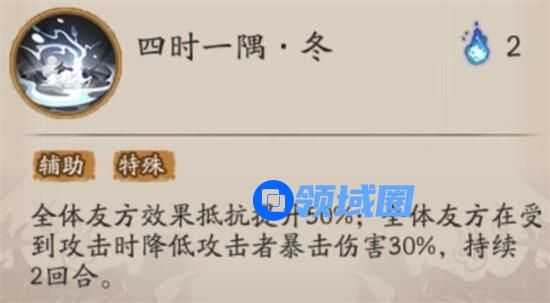 全体友方效果抵抗提升50%;全体友方在受到攻击时降低攻击者暴击伤害30%,持续2回合。