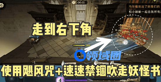 2、接着建议走到右下角放出飓风咒吹走妖怪书,有新出的妖怪书就用速速禁锢捆住然后用飓风咒吹走。