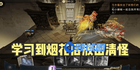 3、当小赫敏学习到烟花后我们就可以放出快速清除妖怪书+消耗马尔福血量,当妖怪书清除完毕,我们便继续使用学习到的强力魔咒攻击马尔福,然后就能顺利通关了。