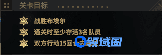 战胜布埃尔;通关时至少存活3名队员;双方行动15回合内通过。