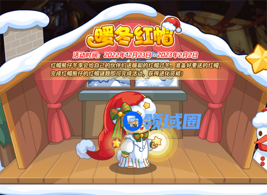 红帽熊仔冬季会给自己的伙伴们送暖和的红帽过冬。准备好要送的红帽,完成红帽熊仔的红帽谜题即可完成活动,获得进化资格!