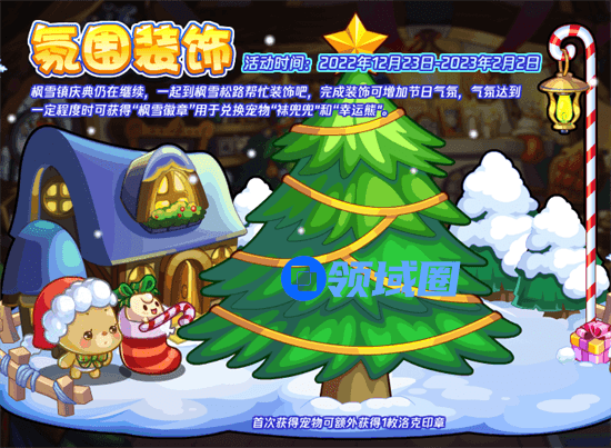 枫雪镇庆典仍在继续,一起到枫雪松路帮忙装饰吧,完成装饰可增加节日气氛,气氛达到一定程度时可获得“枫雪徽章”用于兑换宠物“袜兜兜”和“幸运熊”。