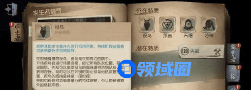 这个可是先知"烦监管"的根本,先知随身携带役鸟,开局就巡视全场,看到队友就会标记队友,全部标记完后返回先知身旁,这个时候先知就可以用役鸟飞向指定的队友获得役鸟的视野,而且观察期间可以驱使役鸟保护该队友一段时间,为其抵挡一次伤害。当役鸟与监管对峙的时候会积累怒气,然后会使它获得额外的行动次数,当场上出现多个先知的时候役鸟的保护时间会降低,先知越多保护时间则越短,役鸟无法保护相中世界的求生者,还有挖地道的守墓人,处于搏命状态给鸟无法积攒怒气值。
