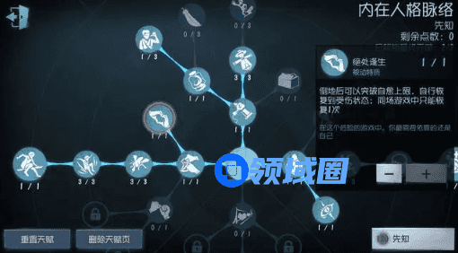 绝处逢生(必点)+不屈不挠:倒地后自愈恢复到半血状态,一局只能恢复一次,有时候会很有用,配合不屈不挠自愈速度加快,倒地后的爬行速度也加快,属于提高存活率的天赋点。