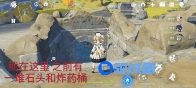 4、这个遗迹位置会显示一个岩之瞳,但是找不到;切回到游戏里面,我这个面前,之前是有一堆石头,还有一个炸药桶,引爆它,会有一个遗迹守卫,打完了只后就会有通道和宝箱,还有岩之瞳。