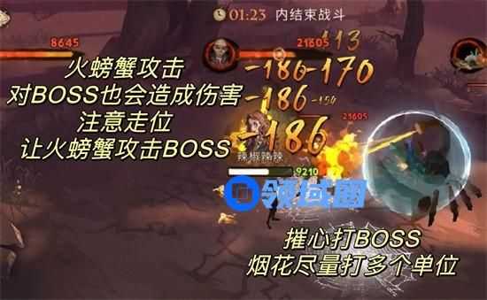 火螃蟹攻击对BOSS也会造成伤害,注意走位,让火螃蟹攻击BOSS。