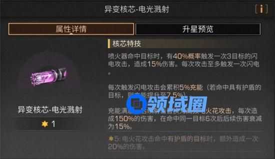 该核芯的主要核芯特技为触发闪电攻击后会累计一定的充能,攻击的目标越多充能的速度越快,在充满能量时,攻击方式变为高频火花攻击。