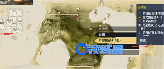 1、进入游戏之后,打开地图,在地图最左侧位置找到【巫咸国】,并且传送过去;