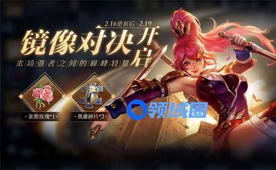 2、活动期间使用指定英雄参与1场镜像对决即可领取:亲密玫瑰*1+英雄碎片*2