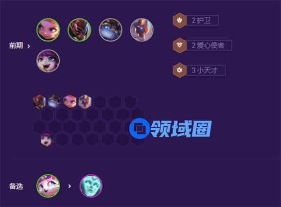 4到5级可以挂猴子开2护卫,挂盲僧开2爱心,或者挂男刀开2福牛。凑不出3天才也没关系,后排单挂一个2星拉克丝或者璐璐打工,前排用加里奥开2吉祥物,4到5级再挂安妮、妖姬或者琴女、盲僧,给C位拼出爱心或者灵能羁绊就行了。