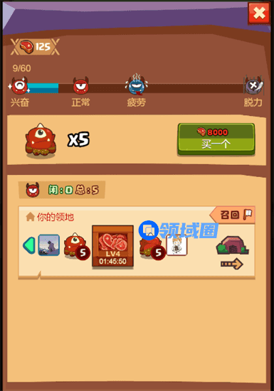 1、相信很多小伙伴都会和小编一样,当我们只差几个肉就能成功达到购买第五个小怪兽的时候,当时的心情会非常的兴奋。毕竟肯定很多小伙伴和小编一样都是零氪玩家,所以很多时候咱们的资源是跟不上的。有些氪金的小伙伴们在领地的初始礼包上他们就能够领先咱们一个小怪兽。所以当零氪党的小编靠着一个一个的去拉肉和别人抢肉,终于靠着自己的努力可以购买新的小怪兽,心情绝对是非常激动的。