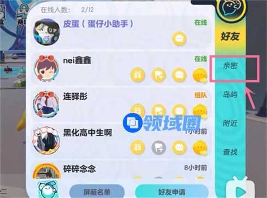 1、大家进入游戏后,点击【好友】选项,然后在好友页面中,选择【亲密】选项。