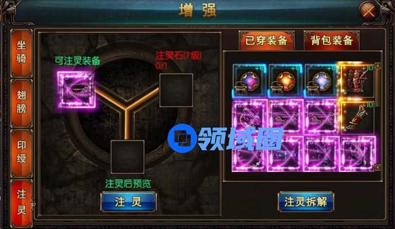 (2)屠龙战神装备注灵:装备通过注灵可以改变附加属性的种类和数值大小。附加属性的上限由注灵的等级控制。