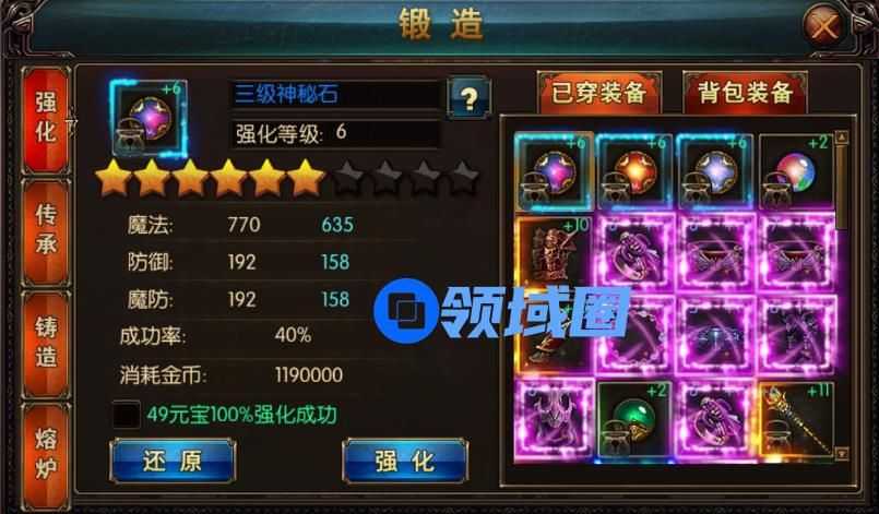 (1)屠龙战神装备强化:装备通过强化可以改变附加属性的种类和数值大小。附加属性的上限由强化等级控制。