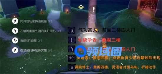比较难找的先祖有灵语者和禅院修士, 他们都在禁阁四楼。 灵语者需要找到一堆鱼骨头,点燃蜡烛后才能激活。 禅院修士就在灵语者对面远方的岛屿,有一块石头,需要用祈祷动作才能激活,让石头变成白色,才可以收集/重温。 萌新一般拿不到这个先祖,因为这个先祖的前置动作,在禁阁一楼四人门。