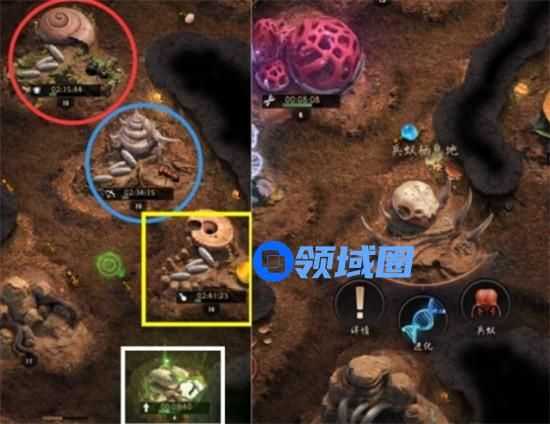 兵种孵化需要近卫蚁孵化地(红色圈),射手蚁孵化地(蓝色圈),运输蚁孵化地(黄色框),结茧介质(白色框),兵蚁栖息地。