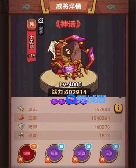 太史慈:太史慈是神话品质的咸将,射手位置,拥有超高的输出能力,战斗过程中可使自身攻击,暴击和生命都得到大幅度提升。