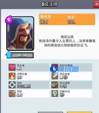 400的血量并不高,重要的是范围伤害高达157(3级数值),并且陆空兼顾,普通的哥布林和亡灵(6级)在它面前都不是一招之敌,瞬间就会被清掉,因此法师是一张非常强大的清场卡,可以瞬间清理大部分威胁肉盾的小兵。