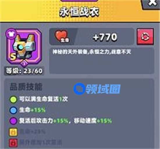 属于杰出+1的装备,绿色品质的时候就可以免费复活一次了,紫武永恒战衣复活后还可以获得15%的攻击力和移动速度加成,尤其是在永恒战衣升级到红色品质后,又可以额外增加一次复活,而且在这之前,橙色品质还可以增加25%的生命值,坦度非常高的同时还有两次复活的容错率,十分推荐。