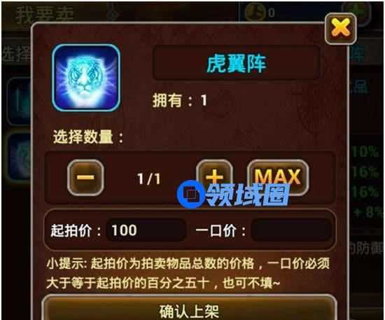 选择需要出售的道具,点击拍卖并输入价格后即可上架,不同VIP等级可同时竞拍和拍卖物品的数量会有所不同。成功交易后系统会向卖房收取一定比例拍卖币作为的手续费。