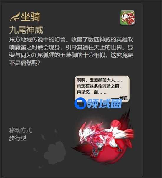 FF14的坐骑可以说是游戏的特色,除了各种整蛊搞怪的坐骑之外,玩家们还可以从游戏副本中获得更稀有的坐骑,而这些坐骑在集齐之后还可以获得一个更为稀有的坐骑。下面让我们来看看这款九尾坐骑都需要多复杂的过程吧。,