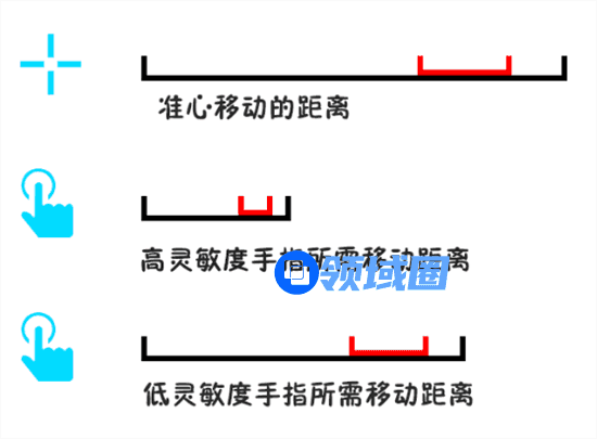 准心移动相同的距离(方向),低灵敏度的手指移动距离要大于高灵敏度。
