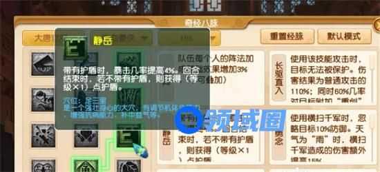 此外大唐经脉可以点扶阵为队友增伤的同时,还可以选择静岳来为自己提供暴击几率和护盾。