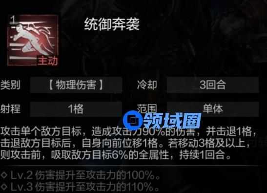 攻击单个敌方目标,造成攻击力90%的伤害,并击退1格,击退敌方目标后,自身向前位移1格。若移动3格以上,则攻击前,吸取敌方目标6%的全属性,持续1回合。